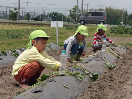 子ども達が穴を掘り、優しく苗を植えて、最後にはお水と子ども達の元気パワーを送りました。美味しいさつまいもができるようにと、神さまにお祈りをして収穫を楽しみにしている子ども達です。子ども達の元気なパワーと神さまからの恵みとで美味しいさつまいもができますように。