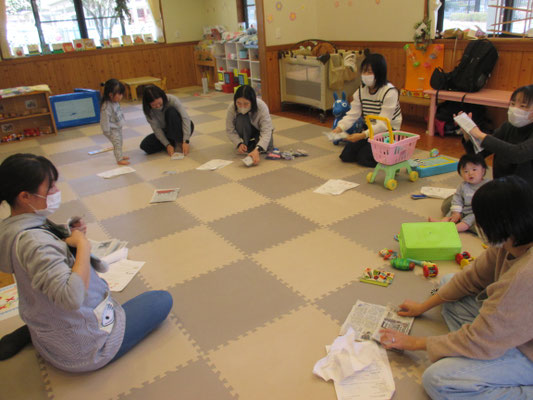 表現遊び…色々なものになって体を動かして、たくさん笑って楽しみました。新しくくるみクラブに参加するお友だちは始め「何をするのかな?」と様子をみていたり、みんなで一緒にすることに何となくドキドキしてしまったりしますが、少しずつ少しずつ楽しめるようになってきます。場の力を借りながらこども達の成長を楽しみに待っていきましょうね。