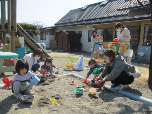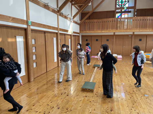 運動遊び…今回はホールに移動してサーキット式で色々な運動を楽しみました。トランポリンと跳び箱からのジャンプが人気でした。自分の身体を自由に使って遊ぶのは楽しいですね。最後はくるみクラブおなじみの「おさるのかごや」での退場となりました。21日はくるみ最終予定でしたが、都合で自由遊びに…「たくさん遊びな」と神様がプレゼントしてくれたような良いお天気で、殆どの子が園庭に出て在園のお友だちと遊んだり、大きなシャボン玉つくりを楽しんだり(ママが)砂場でたくさんたくさん遊ぶことができました。